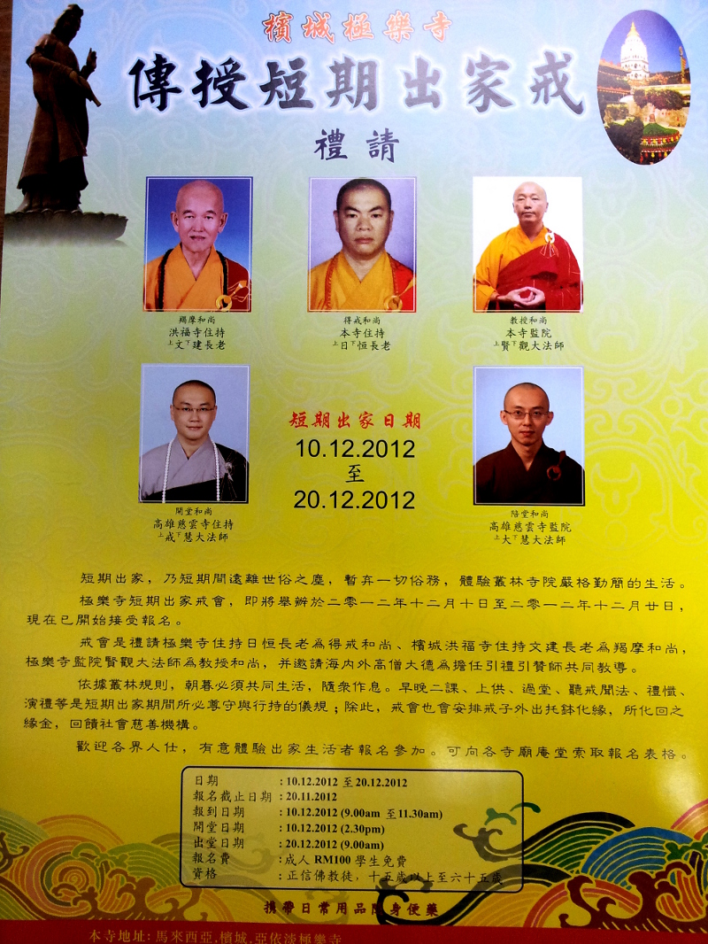 2012年12月10日开始至2012年12月20日结束,为期10天的短期出家。